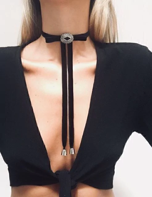 GARGANTILLA TIPO CORBATERO CON CINTA DE TERCIOPELO Y APLIQUE DE FUNDICIÓN METÁLICO NIQUEL.