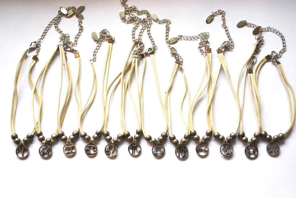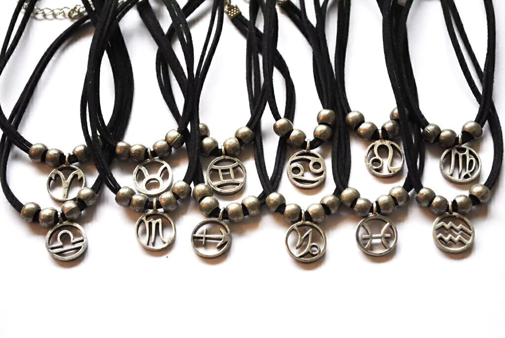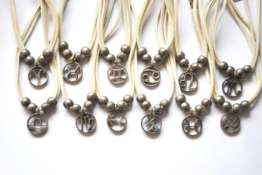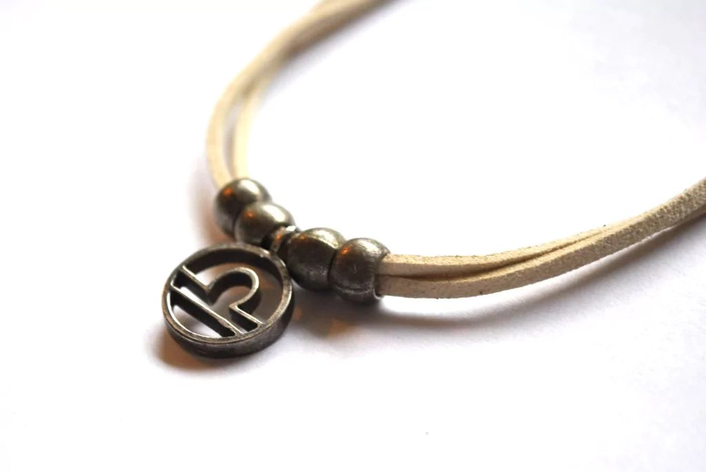 Gargantilla de cuero con dije metalico, del signo del zodiaco.