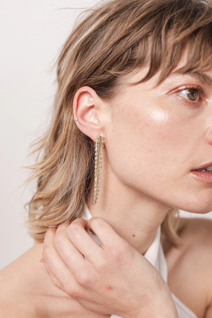 Aros geométricos de bronce en forma vertical con dos tiras de stass en cada costado, bañados en ORO 24K y niquel.